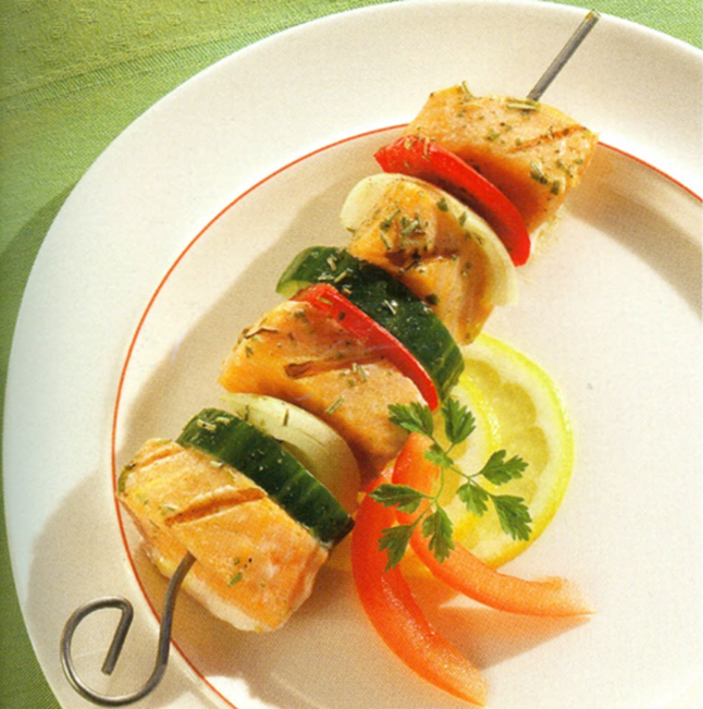 3 Sæt skiftevis fisk og grønsager på spiddene.