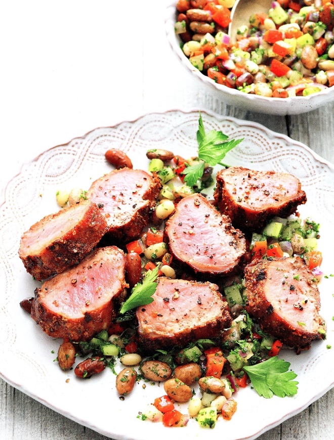der er rullet i lækker krydderblanding og serverer med dejlig bønnesalat. Se