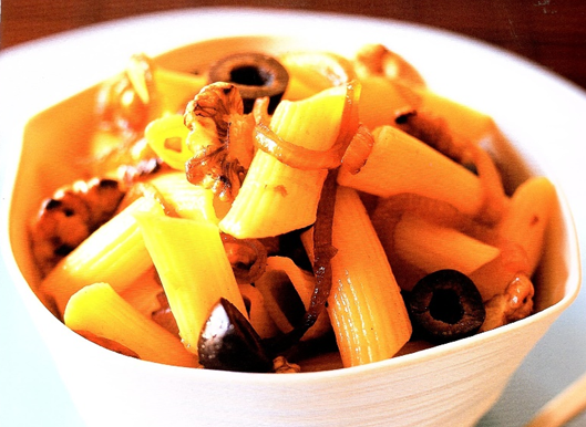 Løgene steges meget langsomt, så de bliver smeltende søde og bløde. Derefter bliver de simpelthen blandet med pasta, sorte oliven og valnødder, som tilsættes lige før serveringen. Giver 6 portioner
